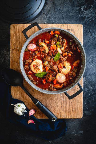 Enjoy extra-succulent slow-cooked meats and rich one-pot stews, thanks to its moisture-retaining, self-basting lid.