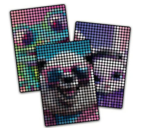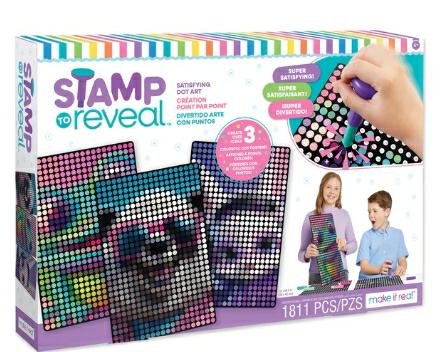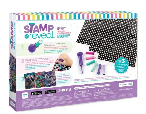 Enjoy the satisfying delight of creating your own dot art posters! Check the stamper for the number on the paper dot, then find the matching number on the poster. Align the circles and stamp! Continue to reveal three colorful dot art posters to hang up and enjoy. Each set contains everything needed to reveal three artworks featuring a DJ bunny, fun frog, and chillin’ panda, including a stamper, dot cartridges, and 1800 dots.