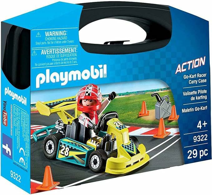 Take the thrill of the racetrack with you everywhere you go with the PLAYMOBIL 9322 Action Go-Kart Racer Carry Case. The set features a racer, a go-kart, petrol canister for filling up and traffic cones to mark your pit-stop area. All pieces fit into the carry case. Perfect for on-the-go fun!