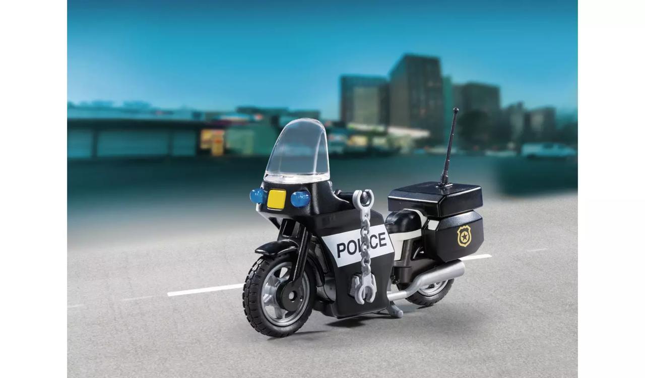 Set includes one police figure, motorcycle, helmet, police sign, flashlight, and additional accessories all stored in a handy case, perfect to play on the go.